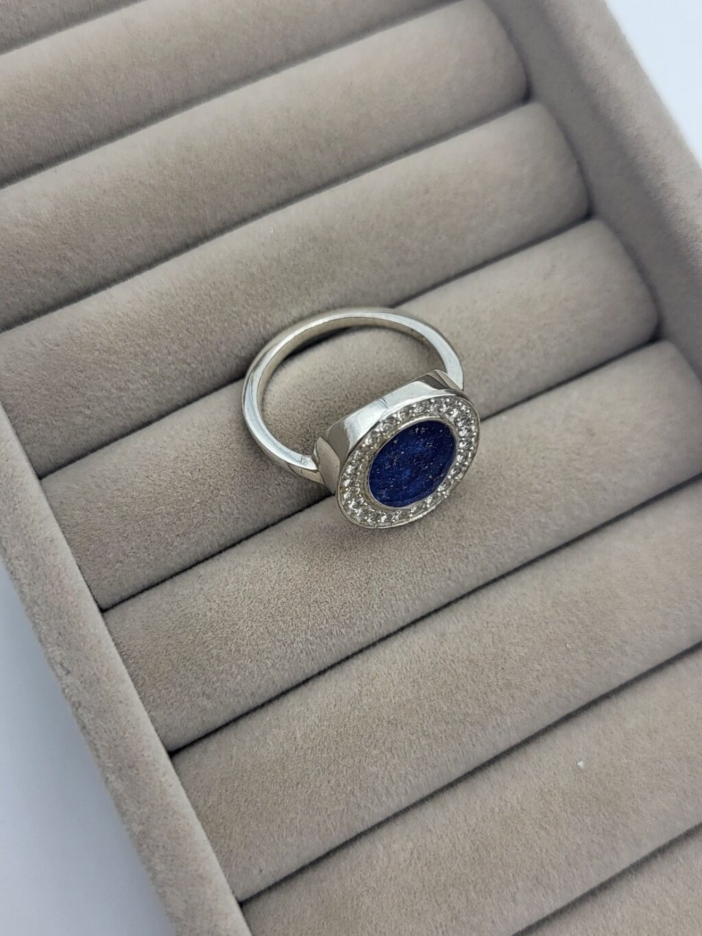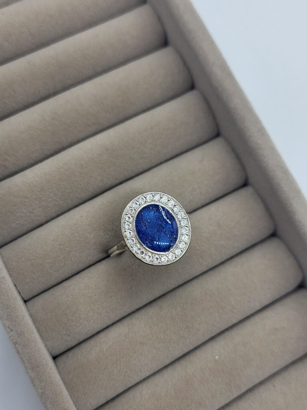 This ladies ‘Elizabeth’ ring is set within an oval cluster of Fine Crystals containing your sentimental inclusions and background colour choice of eighteen colours and birthstone colours.