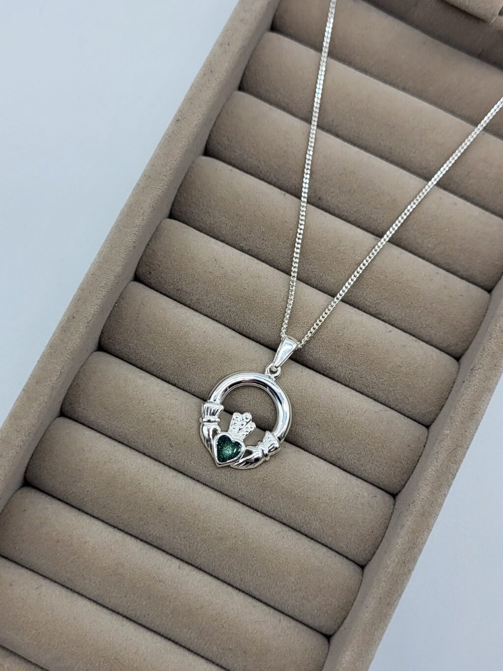 Our solid sterling silver Claddagh Ashes Memorial Pendant is a stunning way of honouring special memories. The ‘Claddagh’ is a traditional Irish symbol that represents Love (the heart), Loyalty (the crown) and Friendship (the hands).