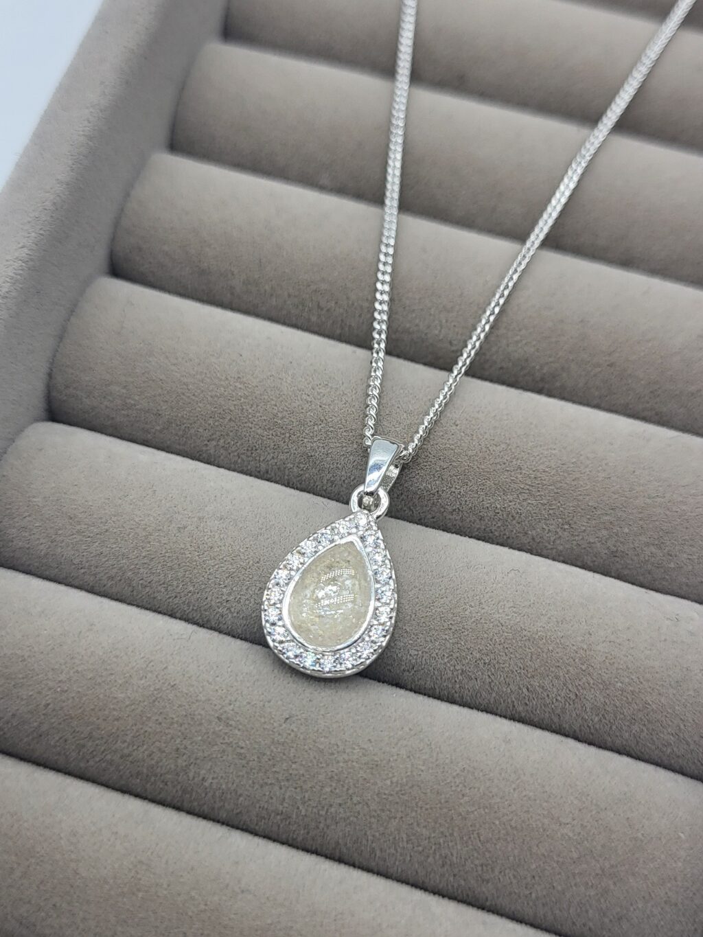 Our solid 925 Sterling Silver Teardrop Pendants are created with your sentimental inclusions encapsulated centre stage. Surrounded by clusters of AAA class CZ crystals. With the added option of Real Diamond Dust to make your inclusions sparkle that little bit more.
