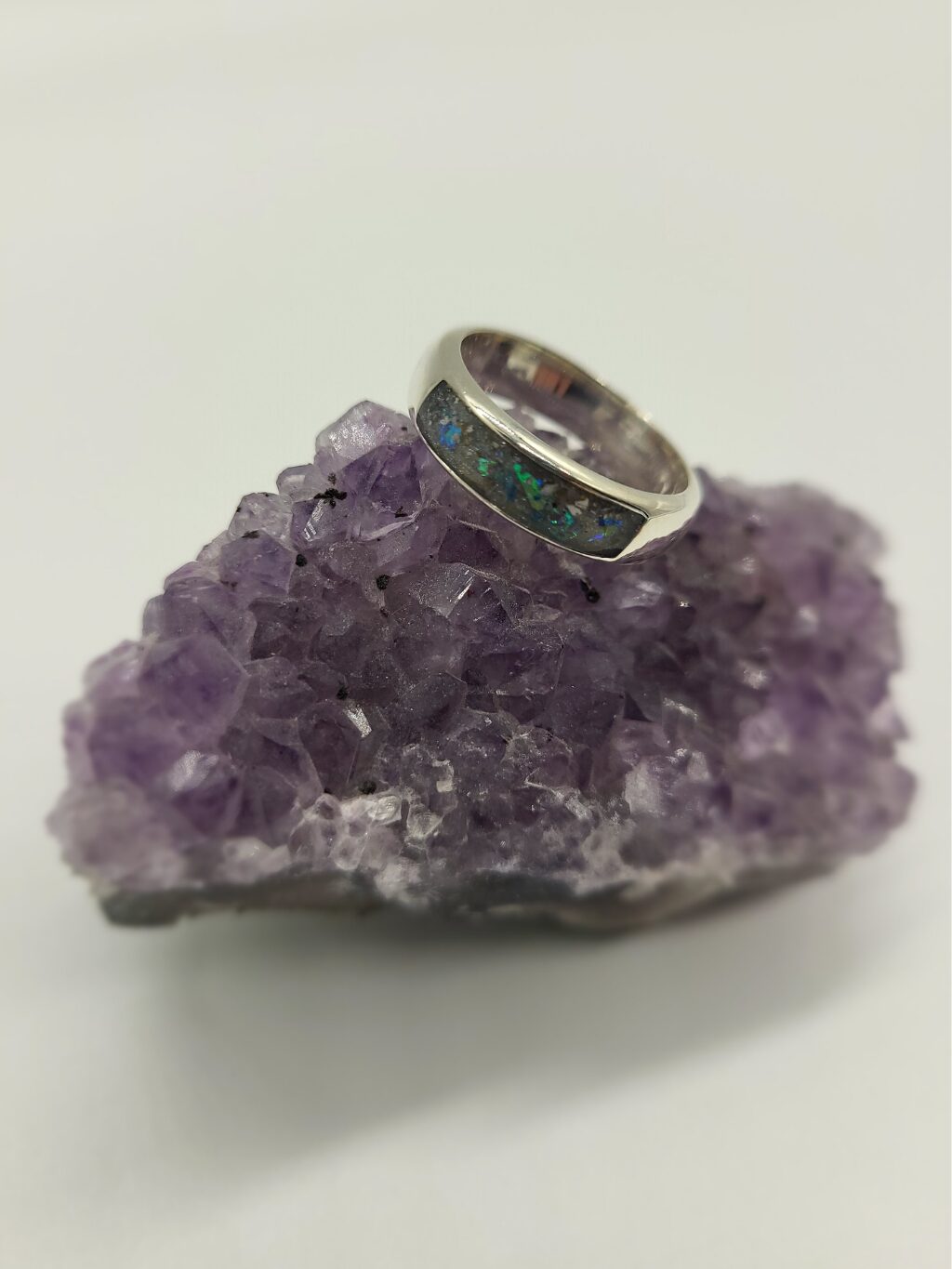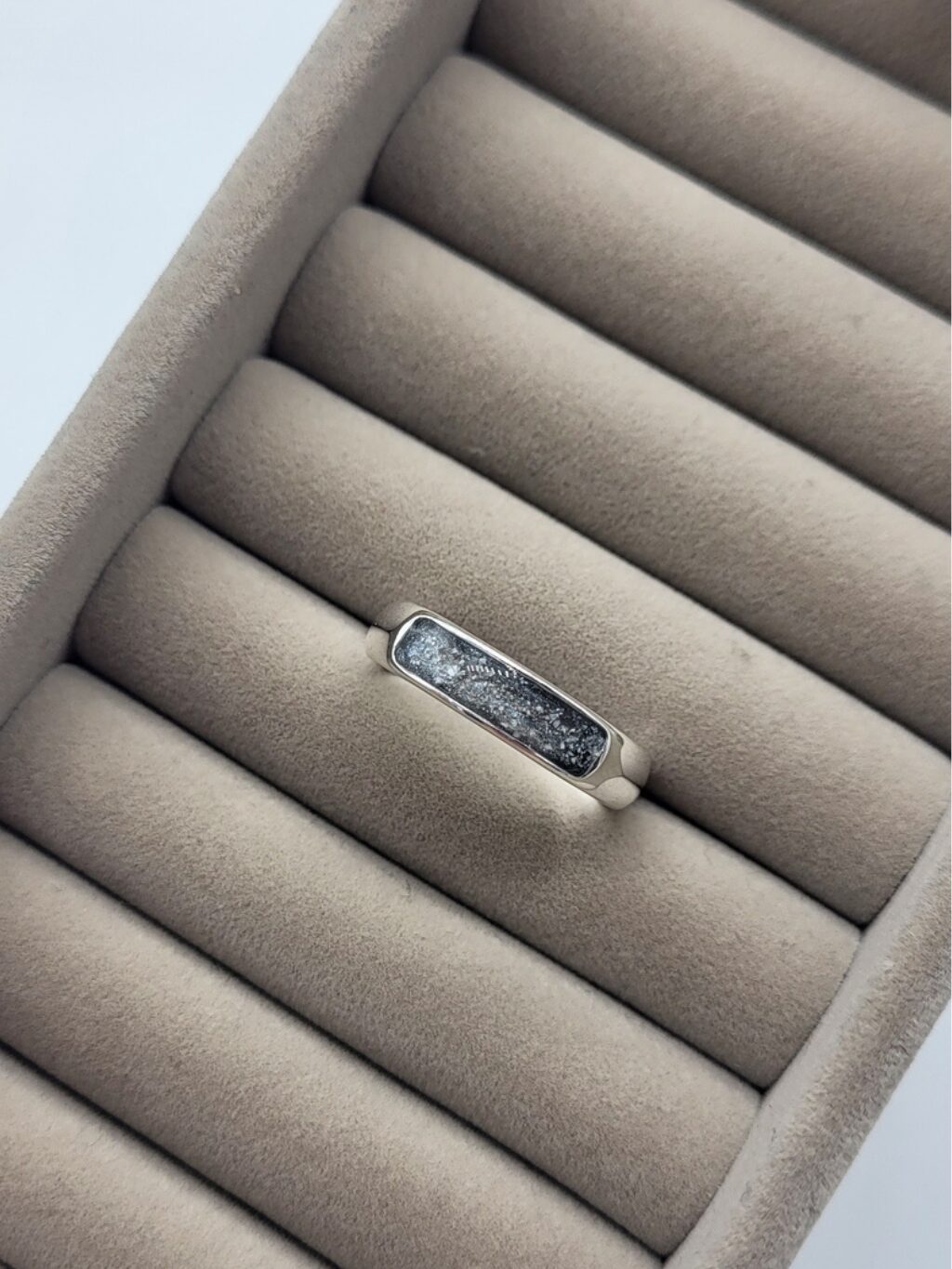 The Kieran Ashes Memorial Ring with its half band 4mm inset is a traditional and elegant style. This unisex memorial ring is a simple wide band-style ring with a central groove for your sentimental encapsulations to be casted.
